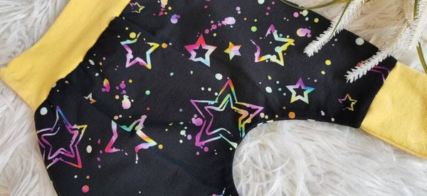Pumphose mit bunten Sternen, gelbe Bündchen.